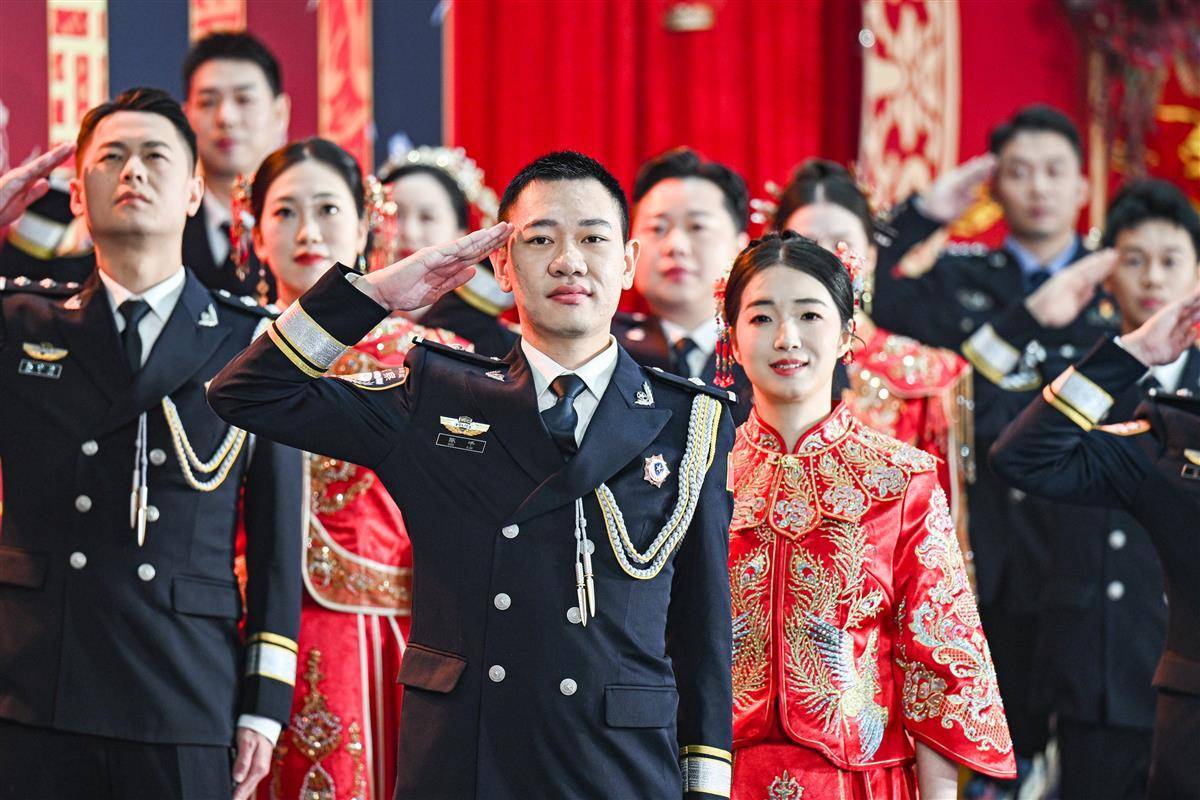 11月19日,伴随着欢乐浪漫的音乐声,一对身穿警服的帅气小伙子挽着身着华服的漂亮新娘走进武汉警察训练基地的警察体育馆。在亲人和同事的见证下,22对武汉公安民警(武汉公安18对、武汉铁路警察4对)一起走向幸福之门,并许下守望相助、并肩前行的郑重承诺。 “没想到,我们挥汗如雨、训练的警察体育馆,竟然是今天最浪漫的婚礼现场!”新郎刘思阳看着身边的新娘,眼里含着笑意。刘思阳是青山分局的一名警察,女友寇宇是勇敢的武汉特警。他们相识第四年,现在就结婚了。刘思阳感慨道:“在最熟悉、最‘硬核’的地方立下君子誓言的感觉,真是独特又特别。”平常有意义。”…………(湖北日报全媒体记者 任勇 杨然 通讯员 吴功轩 摄)